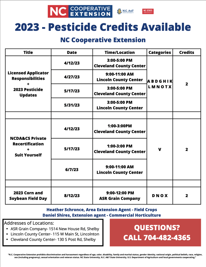 Here is a list of current pesticide continuing education credits in Cleveland and Lincoln counties. There will be more opportunities and classes scheduled for later this year as well.